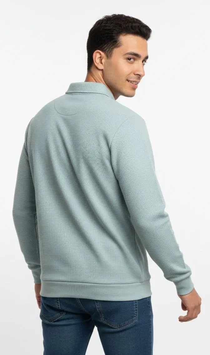 Neckline: Available in two styles (as shown in the images): one with a short metal zipper (half-zip) for a modern touch, and the other with a classic V-neck without buttons.